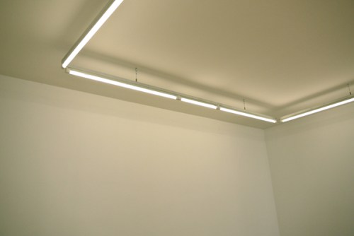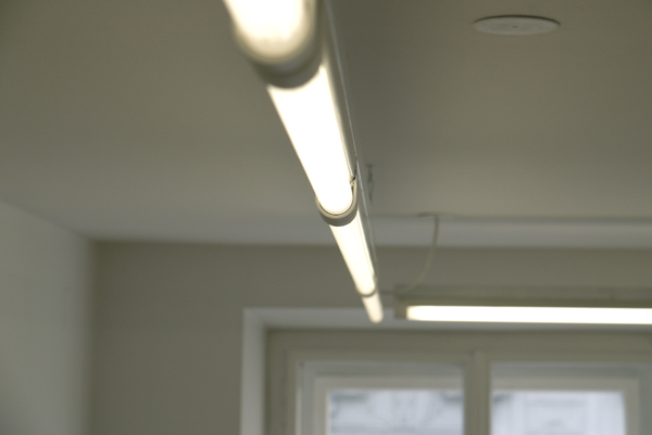 Den Anfang macht die Beleuchtung in der Galerie Andreas Huber: Aluformrohr – Neonbalken aus dem Baumarkt – perfektes Licht für die neue Galerie.